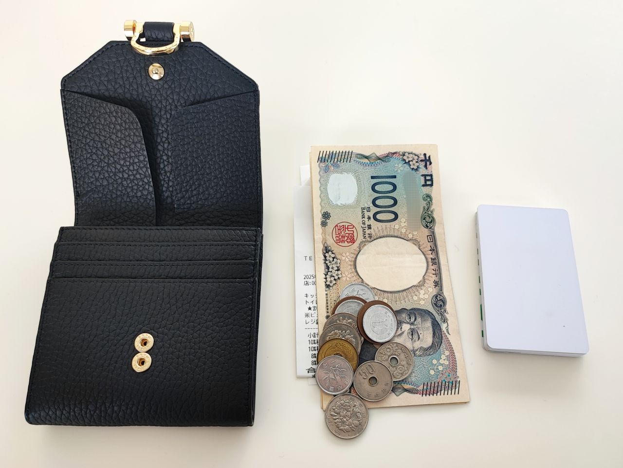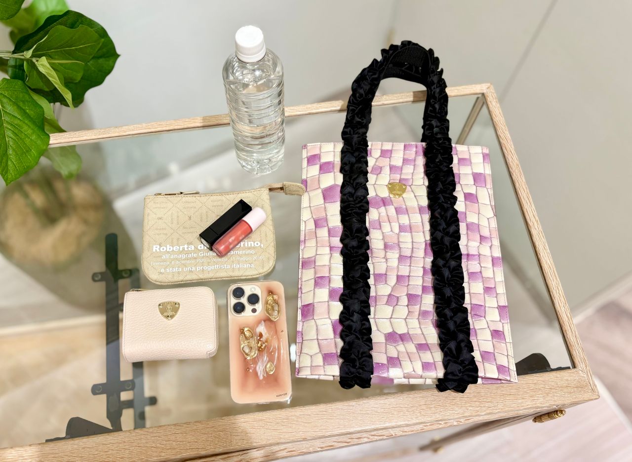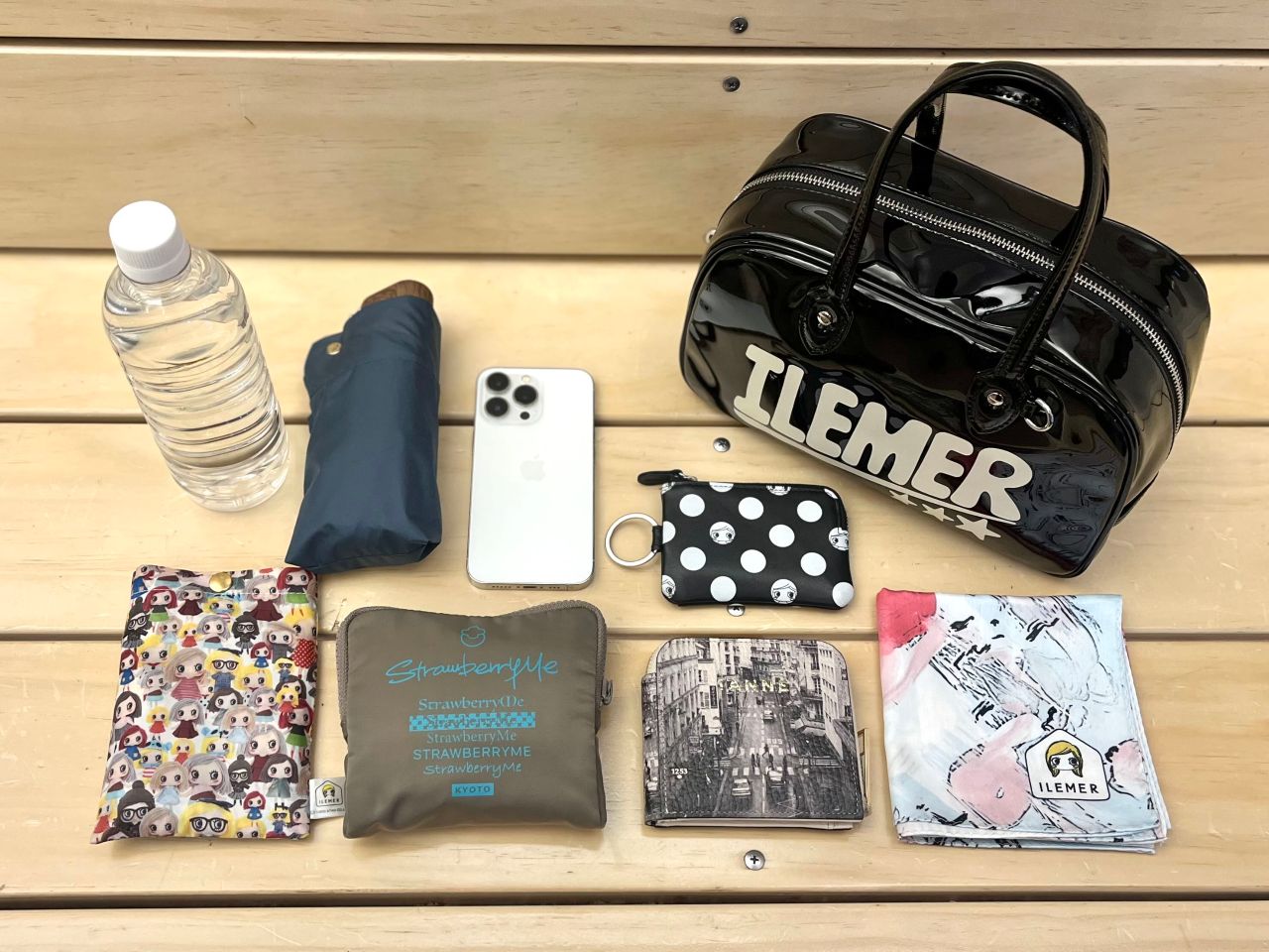 (ペットボトル、折りたたみ傘、スマートフォン、キーケース(ジジ)、ハンカチ、ミニ財布、ポーチ、エコバッグ)