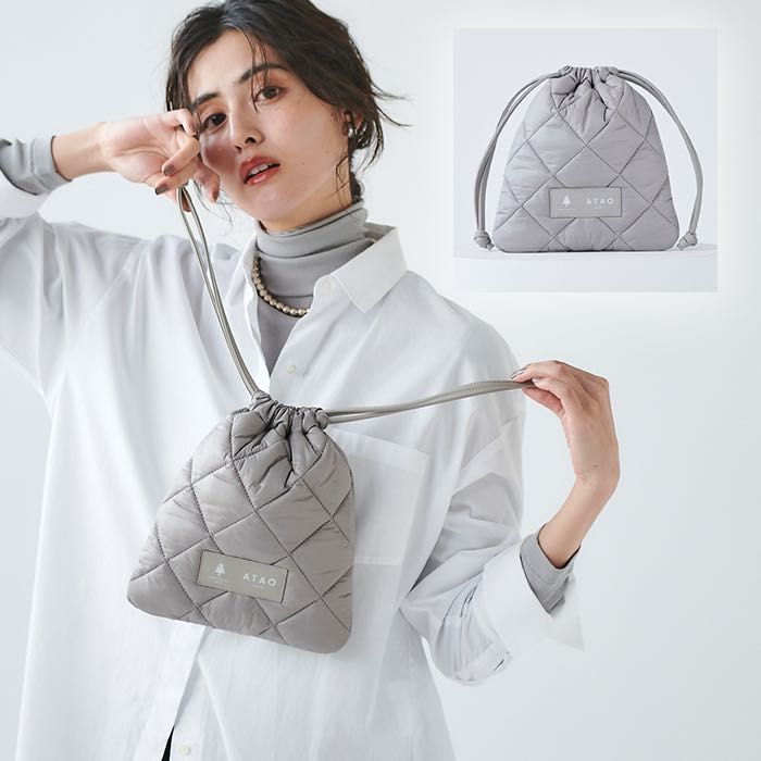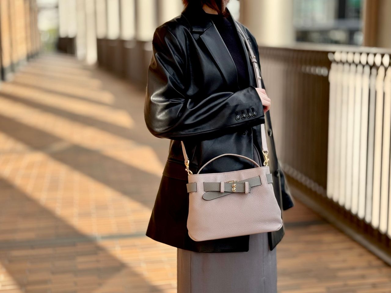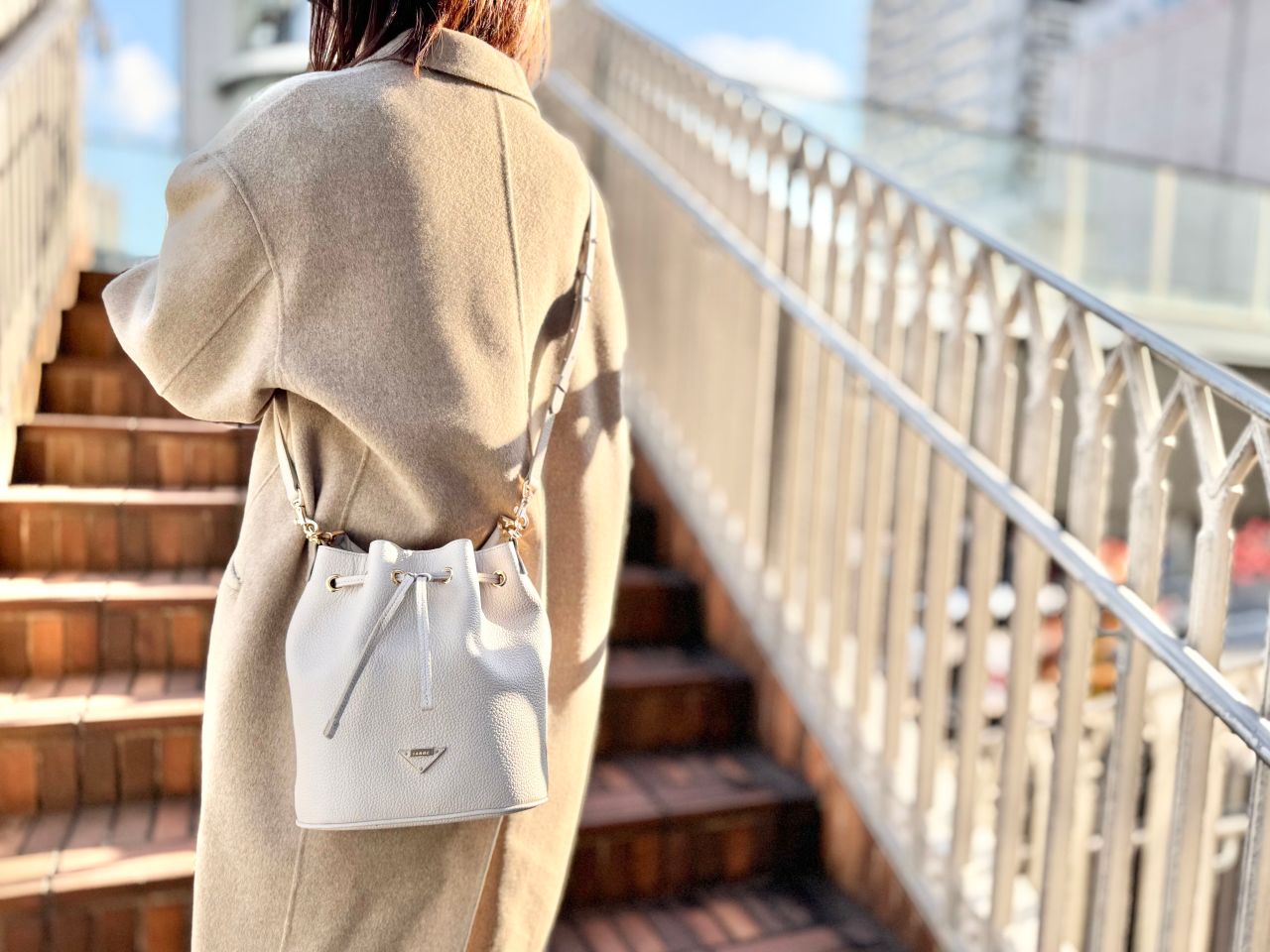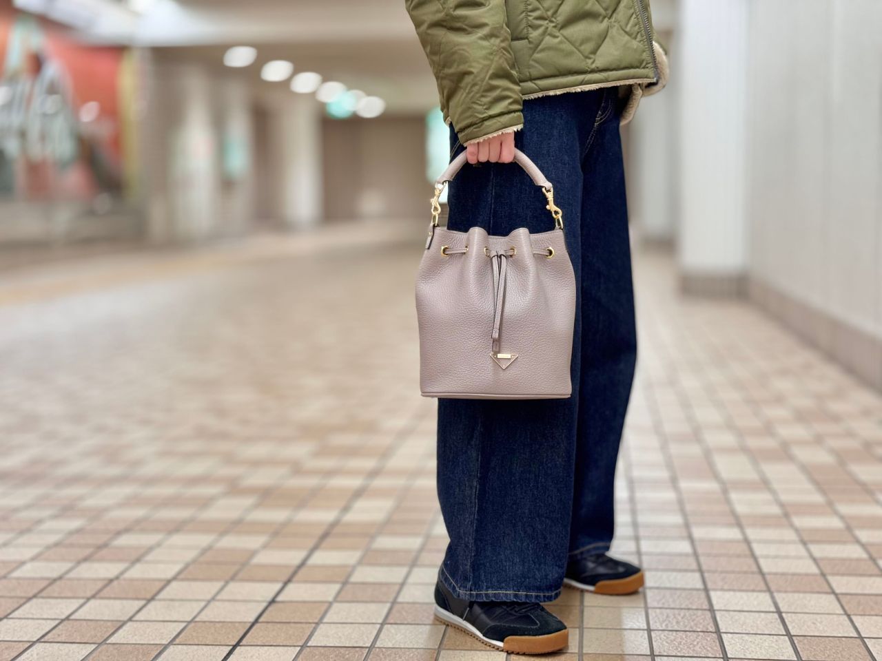 上質レザーの巾着バッグは、ラフだけどきちんと見えするミニマルすぎないサイズ感の2wayバッグ!
