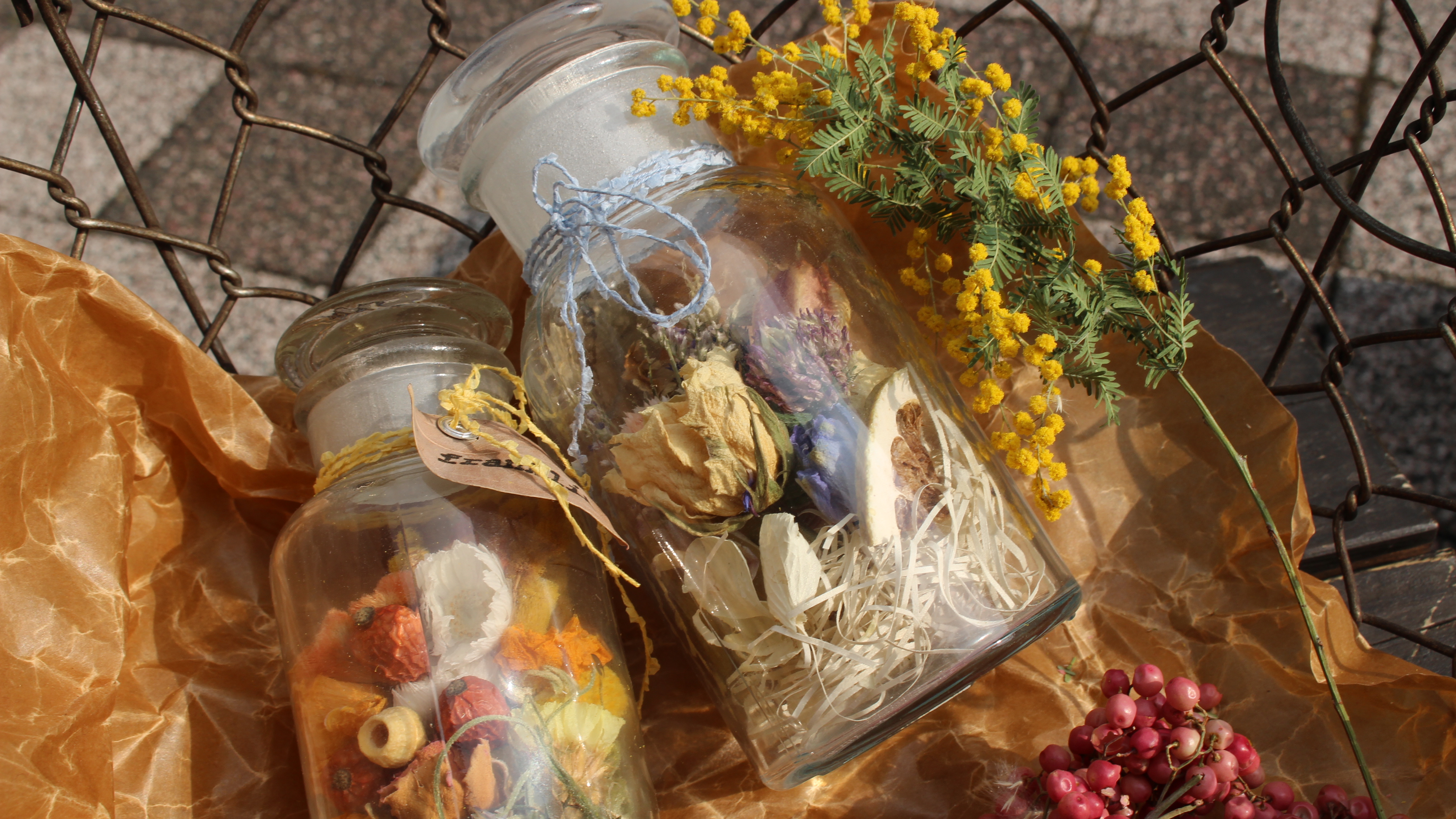 アンティークな雰囲気のメディシンボトルアレンジメント