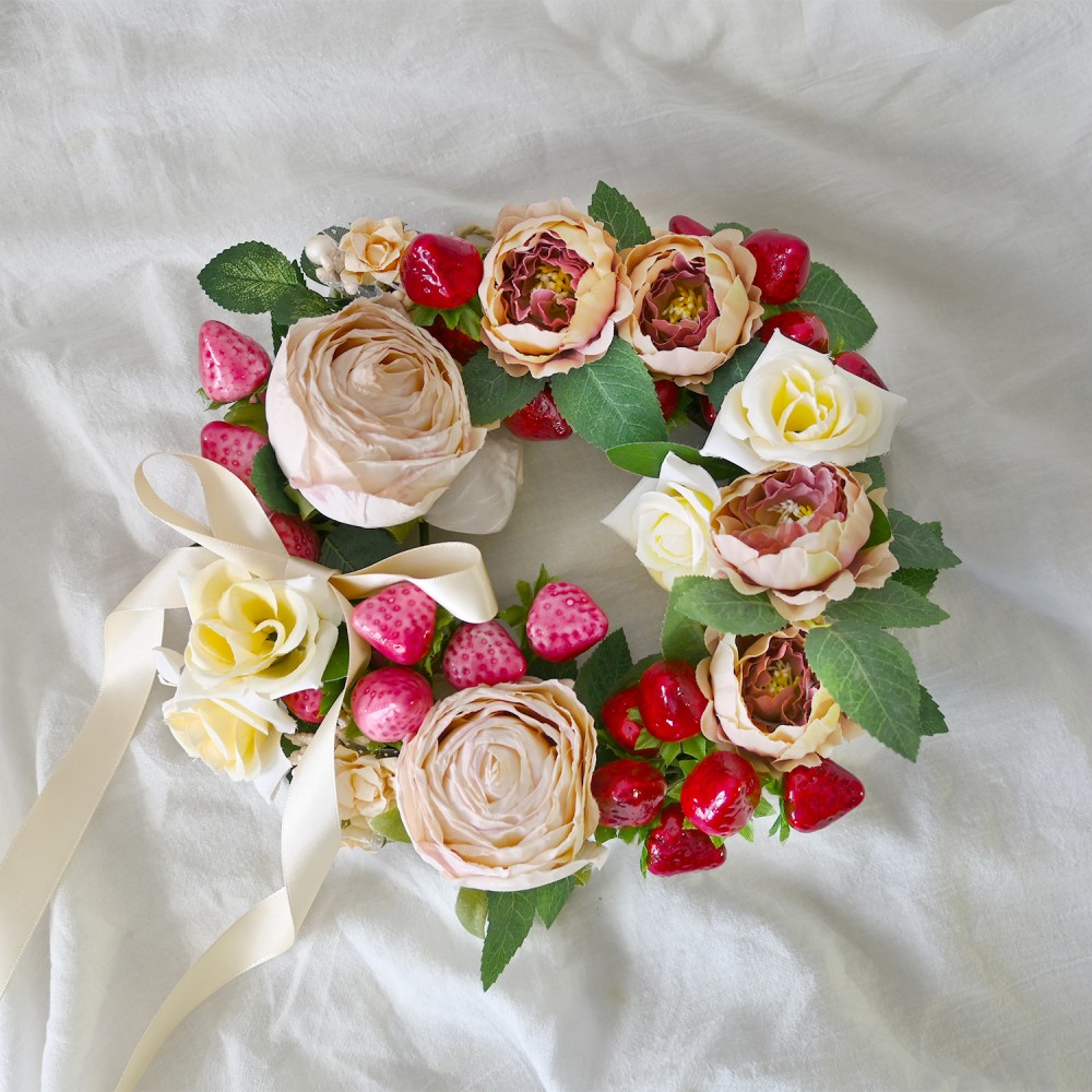 2種類の色のイチゴとラナンキュラスのお花がアンティークな雰囲気を添え、