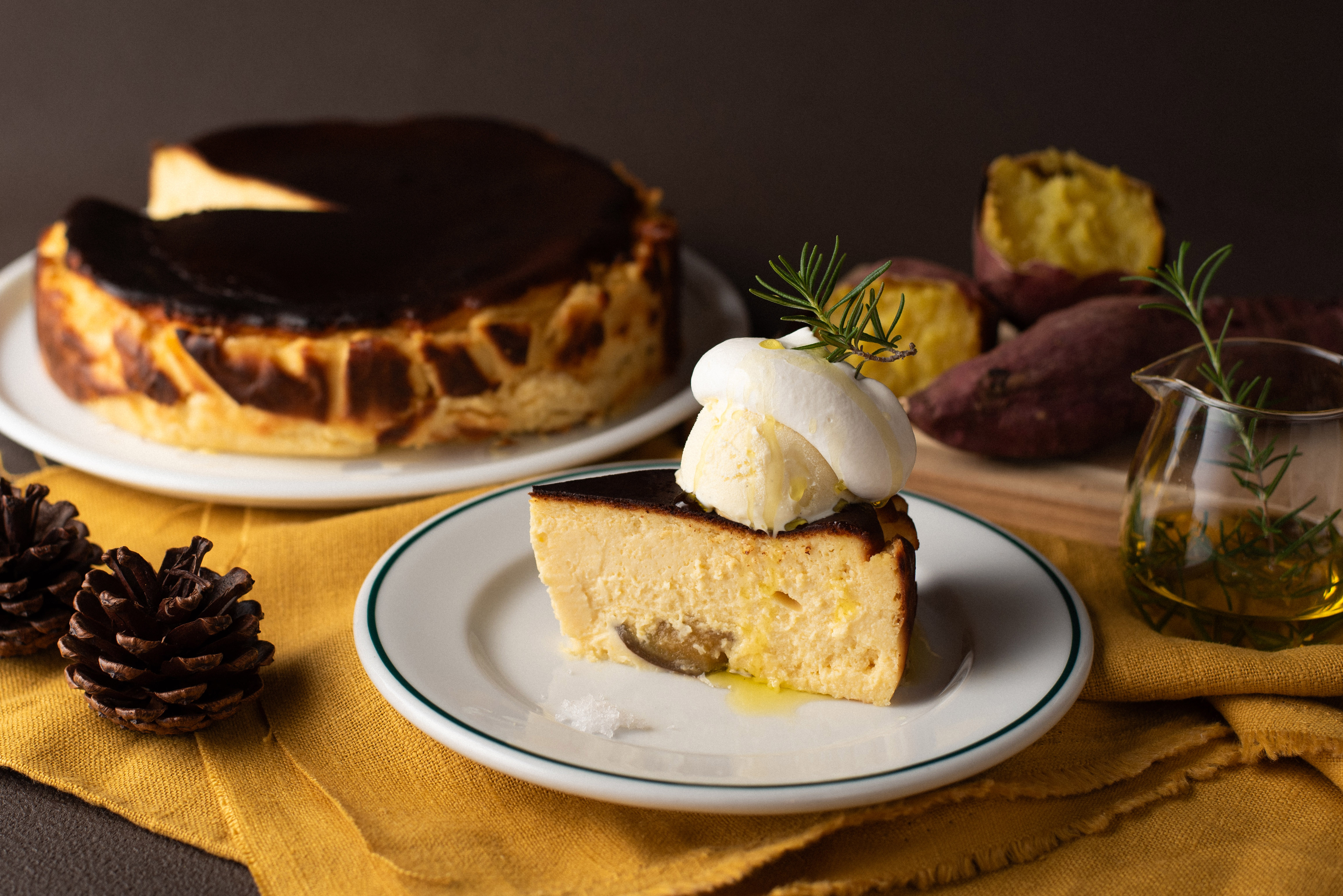 安納芋のやさしい甘みと、とろり濃厚なチーズのコクがとけ合う、秋限定の焼き芋バスクチーズケーキ。淡路島産ローズマリーを漬け込んだ香り高いオイルで仕上げ、ハーブの爽やかな余韻が広がります。お好みで淡路島のおのころ雫塩をひとつまみ加えると、甘さがより際立ちます。