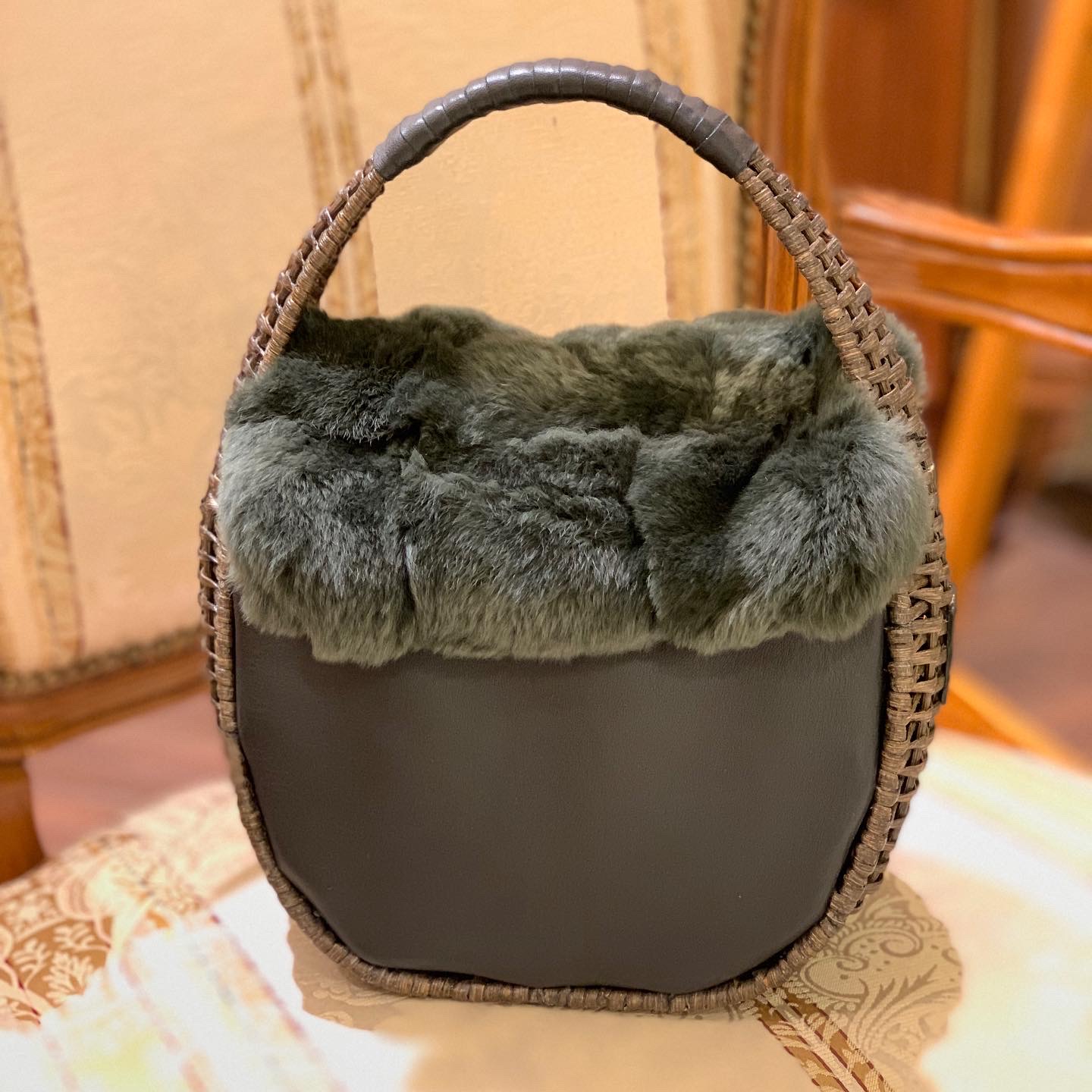 カゴとレッキスファーのコンビが個性ありのバッグが入荷しました。