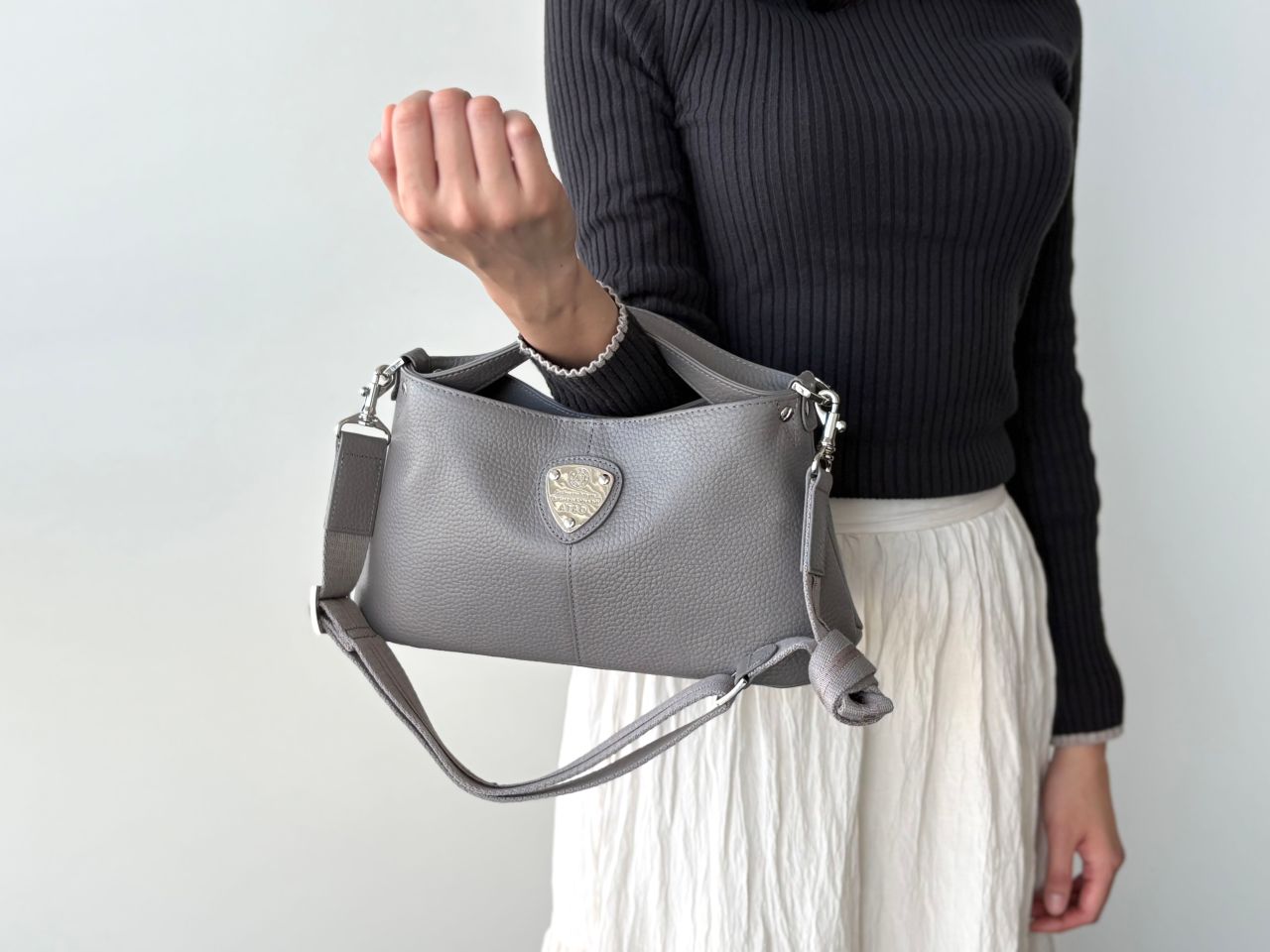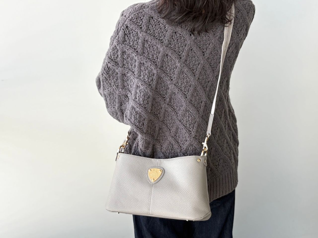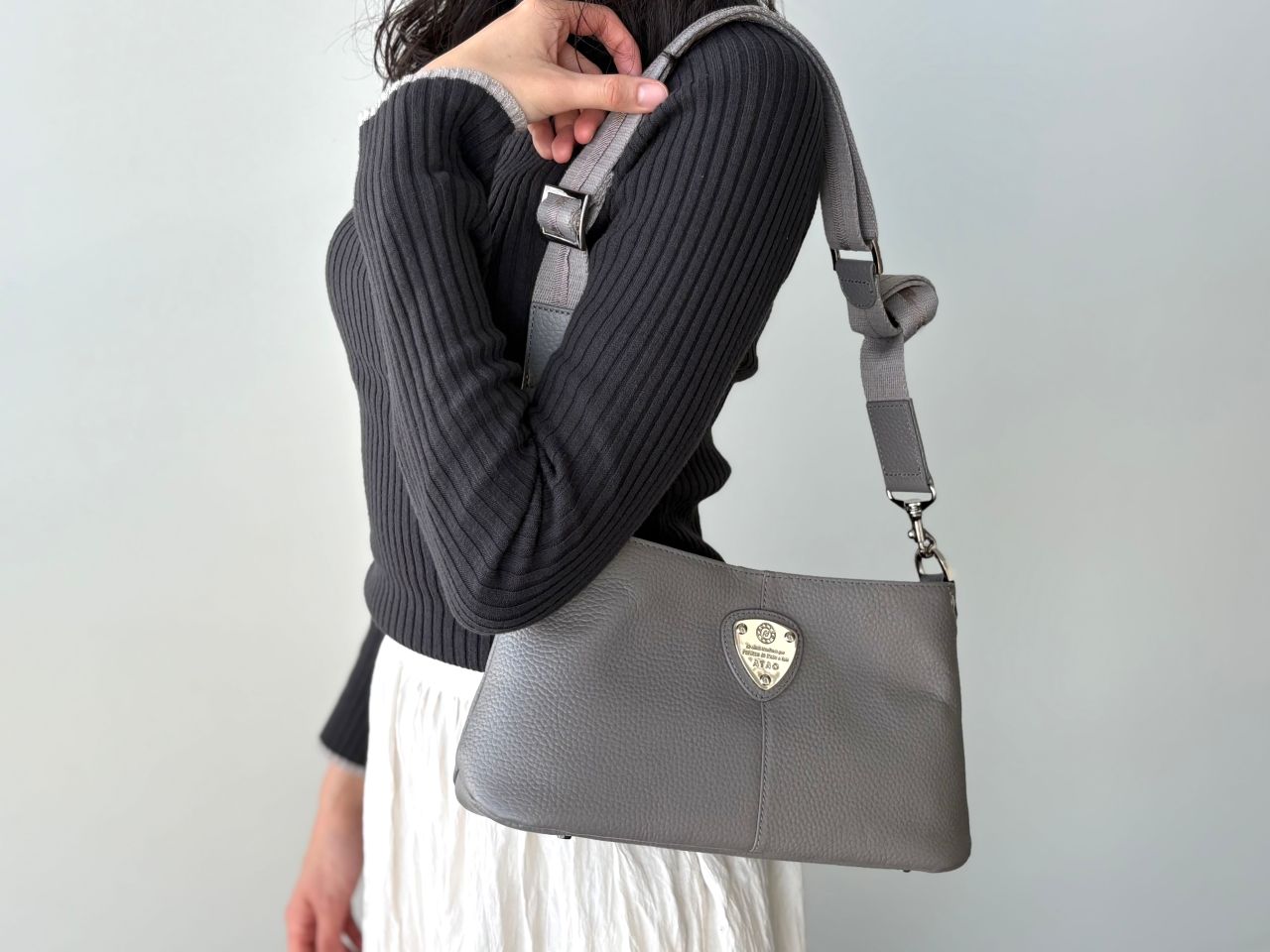 コロンとした丸みのあるフォルムに、中央のエンブレムが印象的ですよね。「派手すぎないのに、ちゃんと可愛い」という絶妙なデザインが、多くの方に選ばれている理由の一つでもあります。新色のストーングレーは金具はゴールドではなくシルバーでおつくりしています。