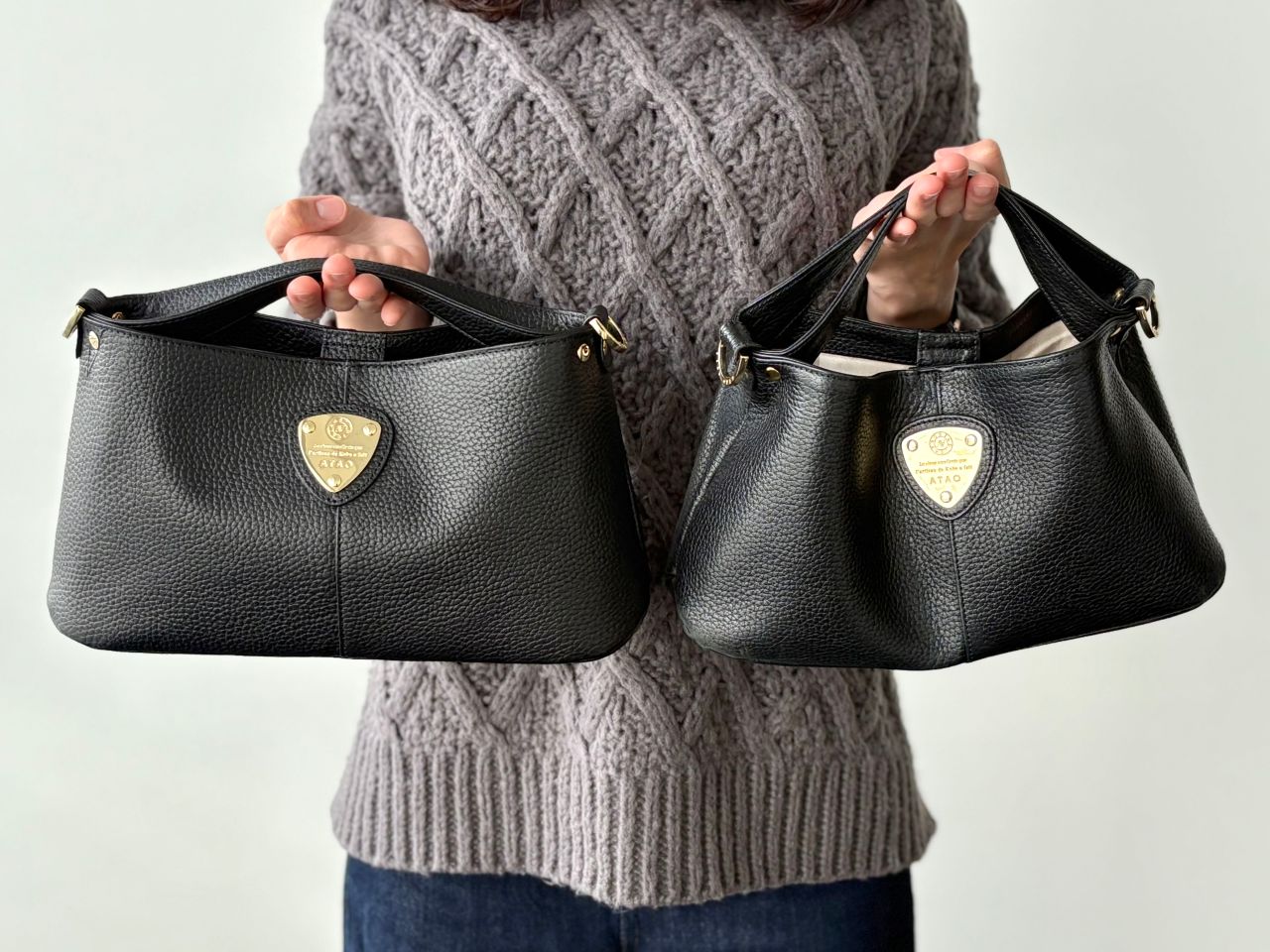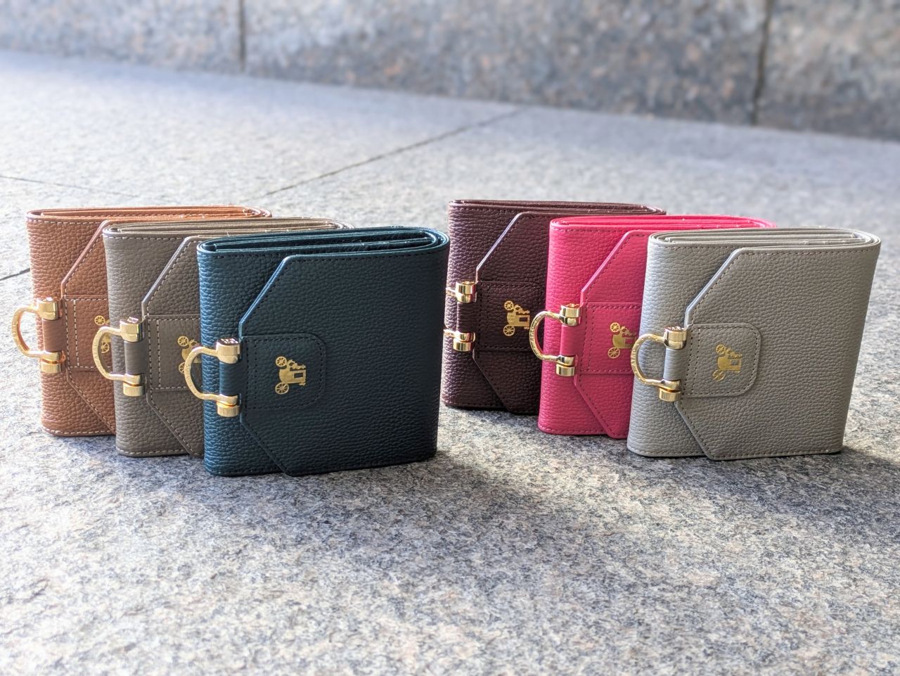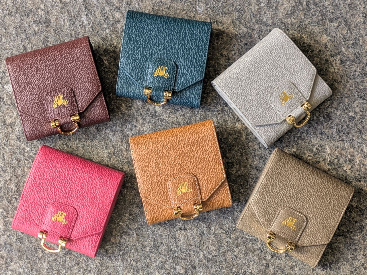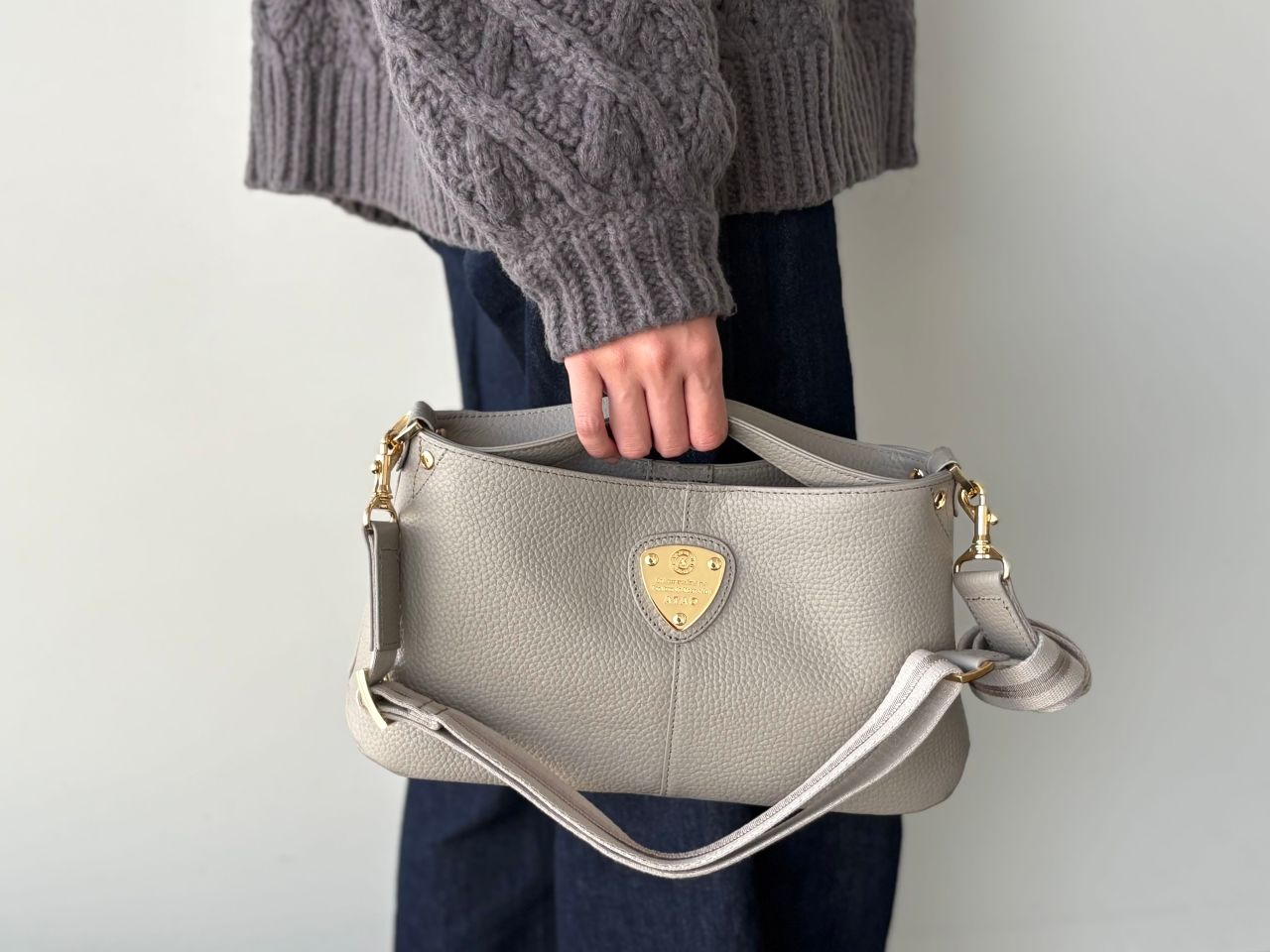 コロンとした丸みのあるフォルムに、中央のエンブレムが印象的ですよね。「派手すぎないのに、ちゃんと可愛い」という絶妙なデザインが、多くの方に選ばれている理由の一つでもあります。新色のストーングレーは金具はゴールドではなくシルバーでおつくりしています。
