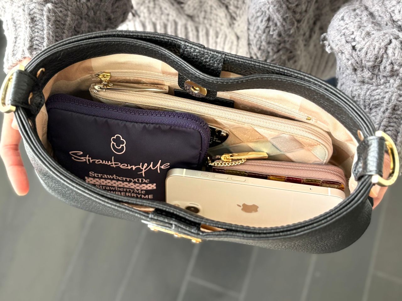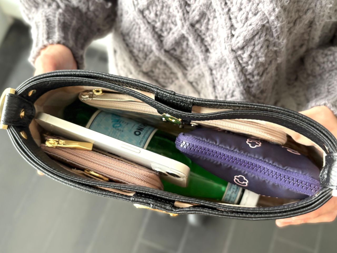 chivy+は小ぶりに見えますが、収納力は想像以上。長財布、ポーチ、キーケース、スマホを入れてもまだまだ余裕があります!