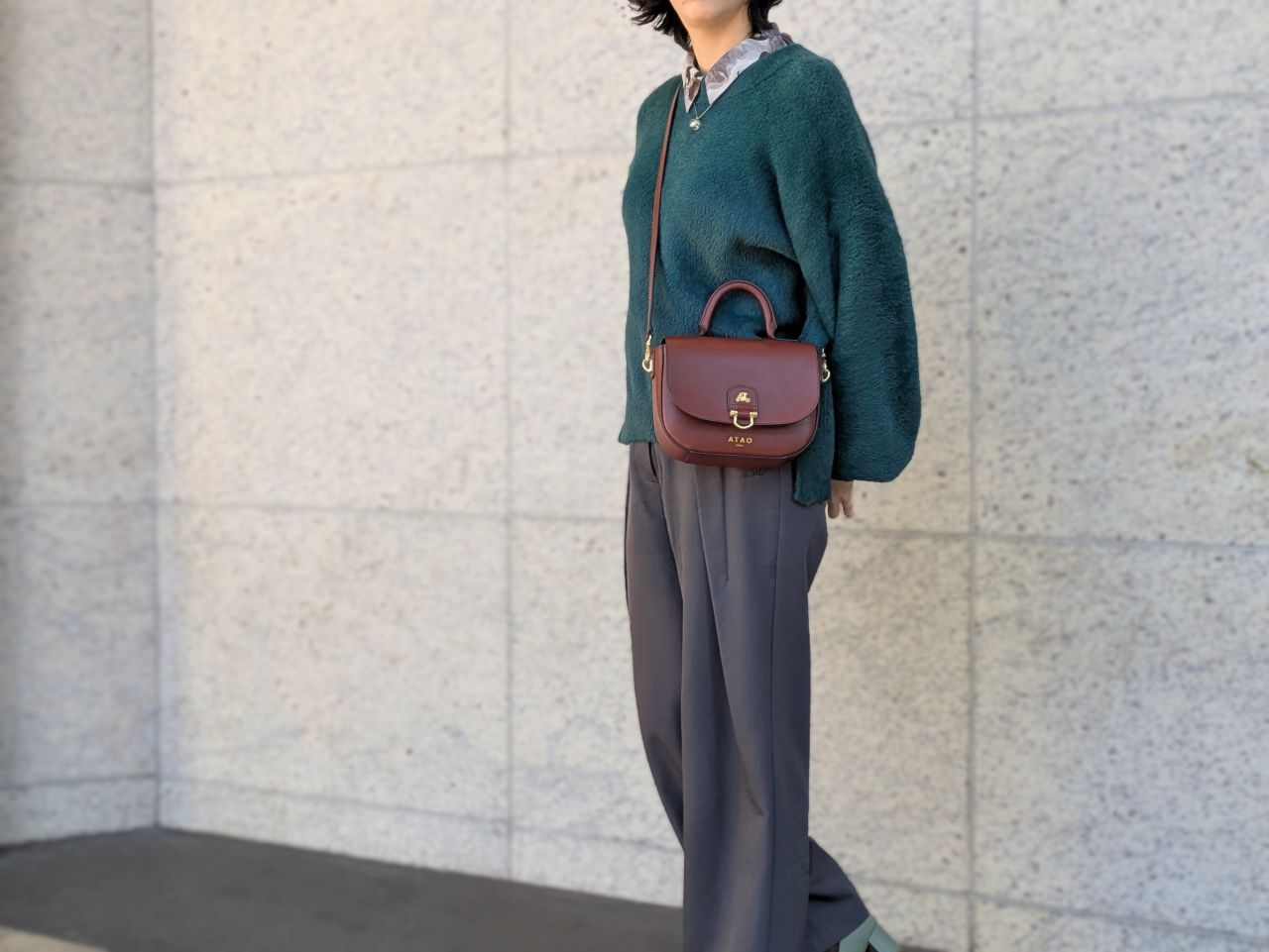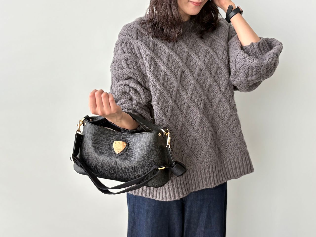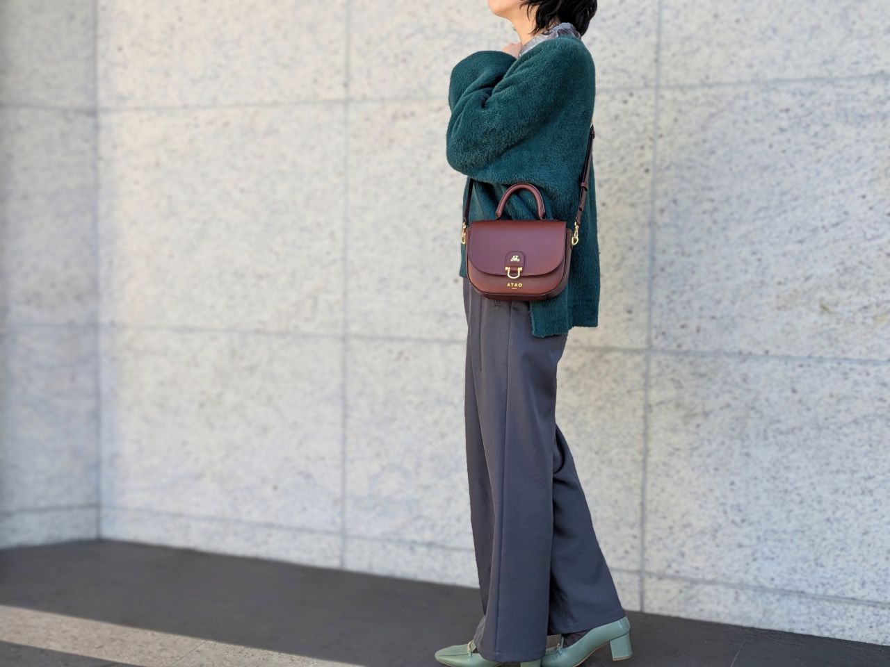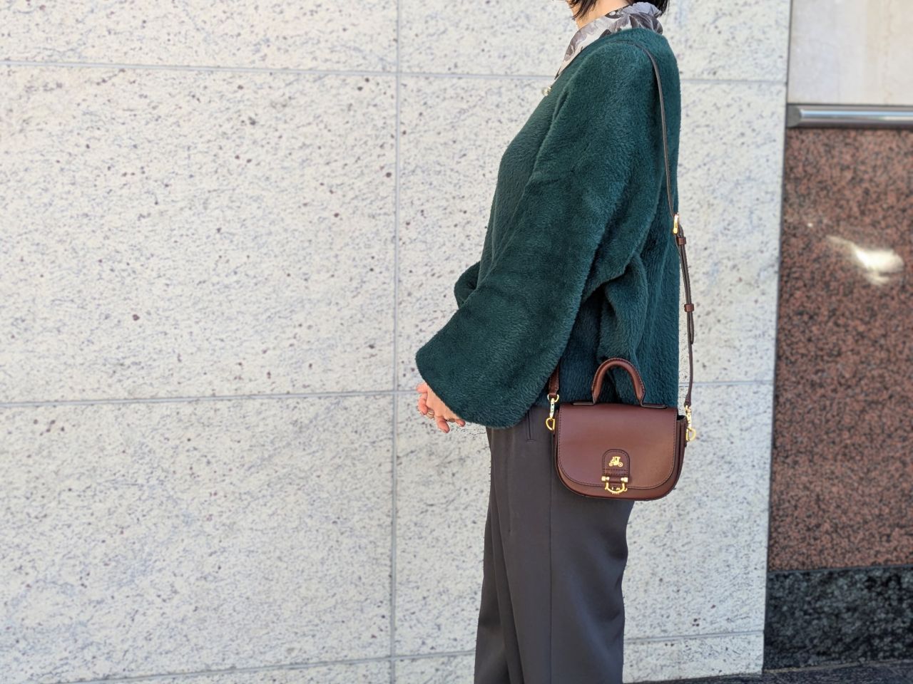 冬はモコモコニットやウールコートなど、素材に存在感がある季節。chivy+の上質なレザーは、そんな冬服にもしっかり馴染みつつ、品よく見せてくれます。
