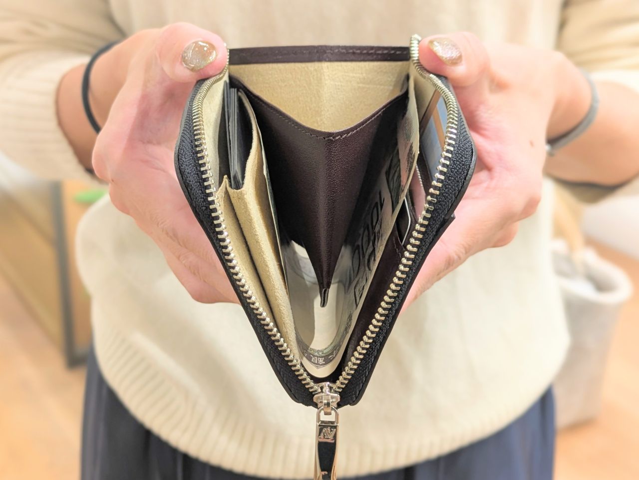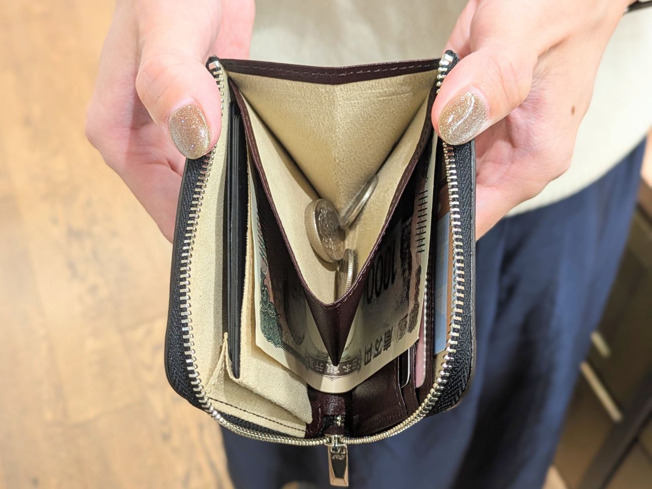 U字にお札をコインポケットの下に滑り込ませる仕様となっており、これがファスナーを一度開けばカード、紙幣、硬貨がすべて見渡せる、そしてすべて出し入れしやすいという使いやすさを実現しています。