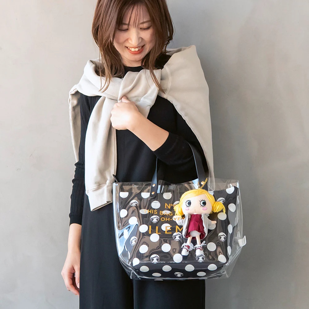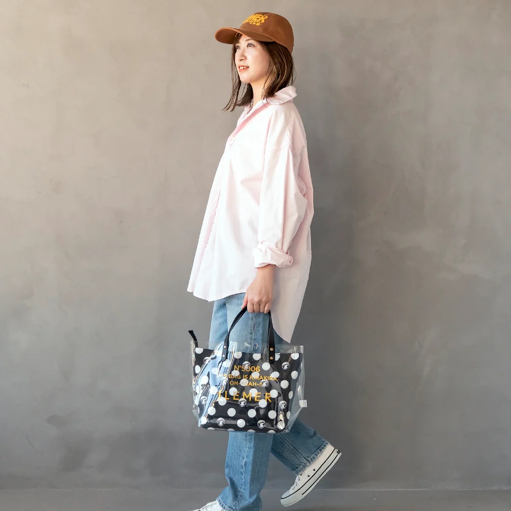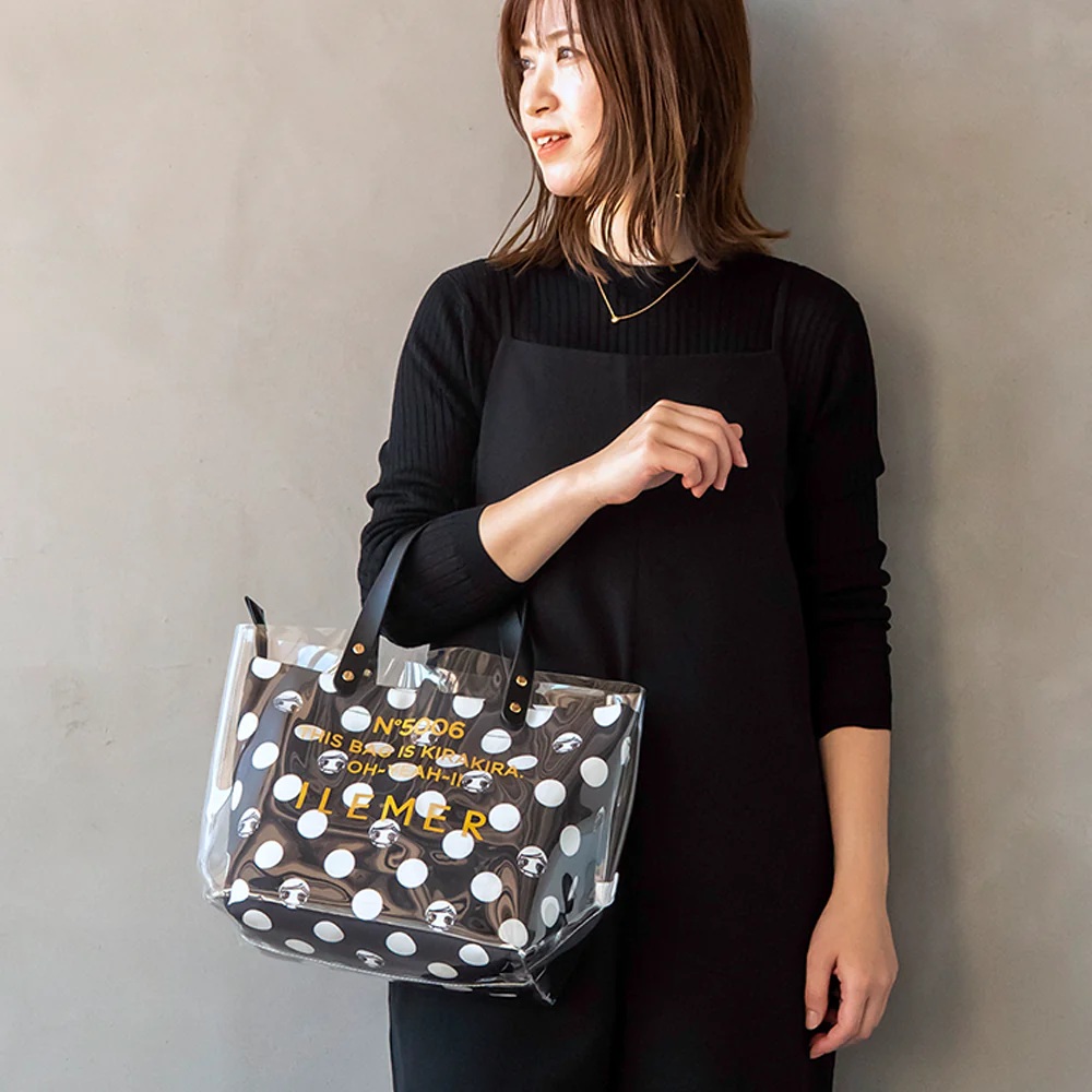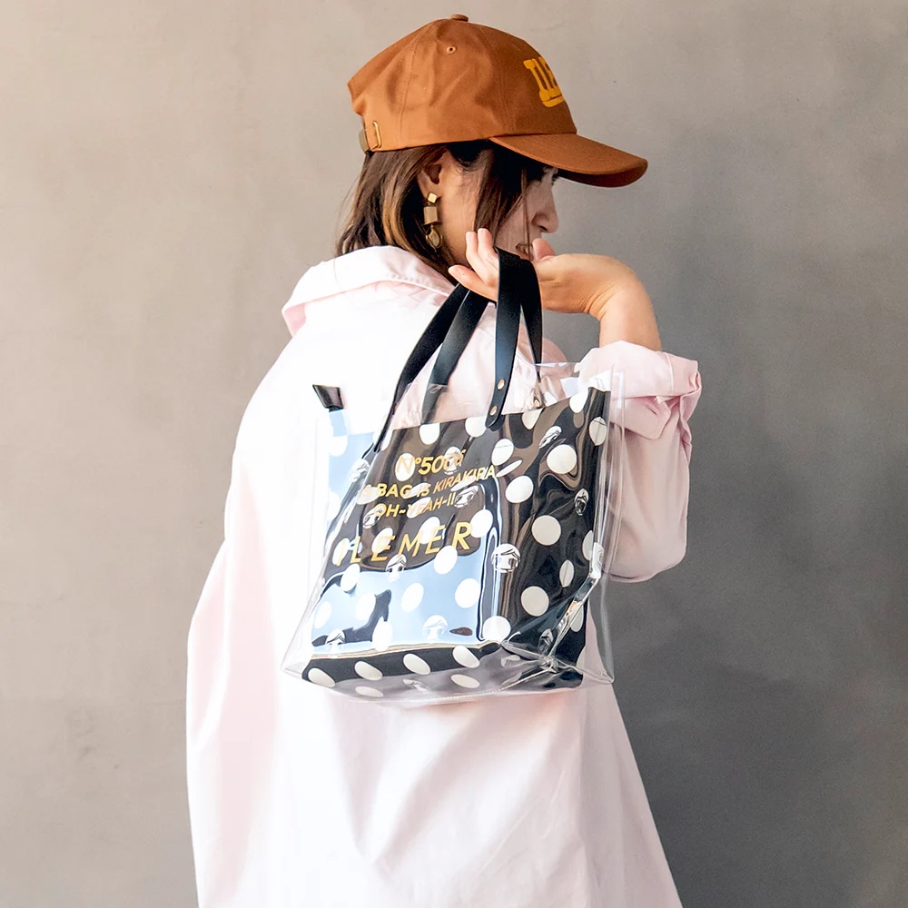 「ビニールバッグは夏のイメージ」という方もいらっしゃるかもしれませんが、黒の面積が多い水玉ブラックは特に秋以降も持ちやすいかと思います♩