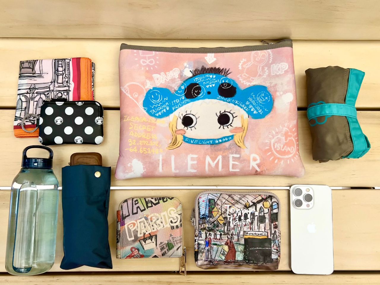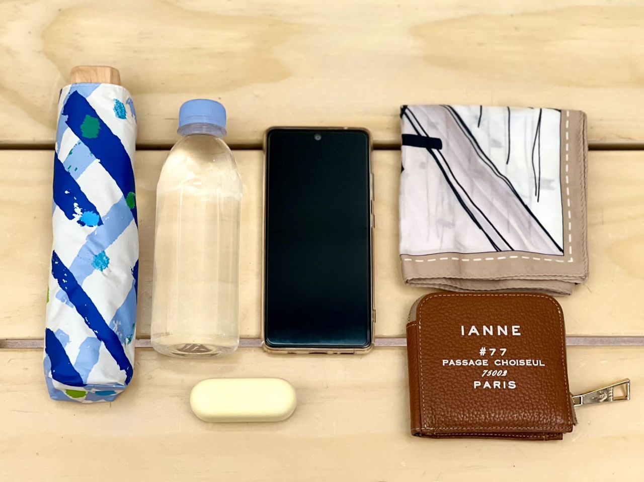ハンカチ、エコバッグ、携帯、財布、ポーチ、日焼け止め