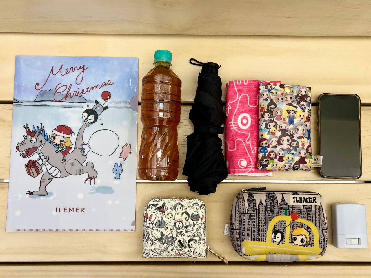折り畳み傘、ペットボトル330ml、携帯、ハンカチ、財布、ワイヤレスイヤホン