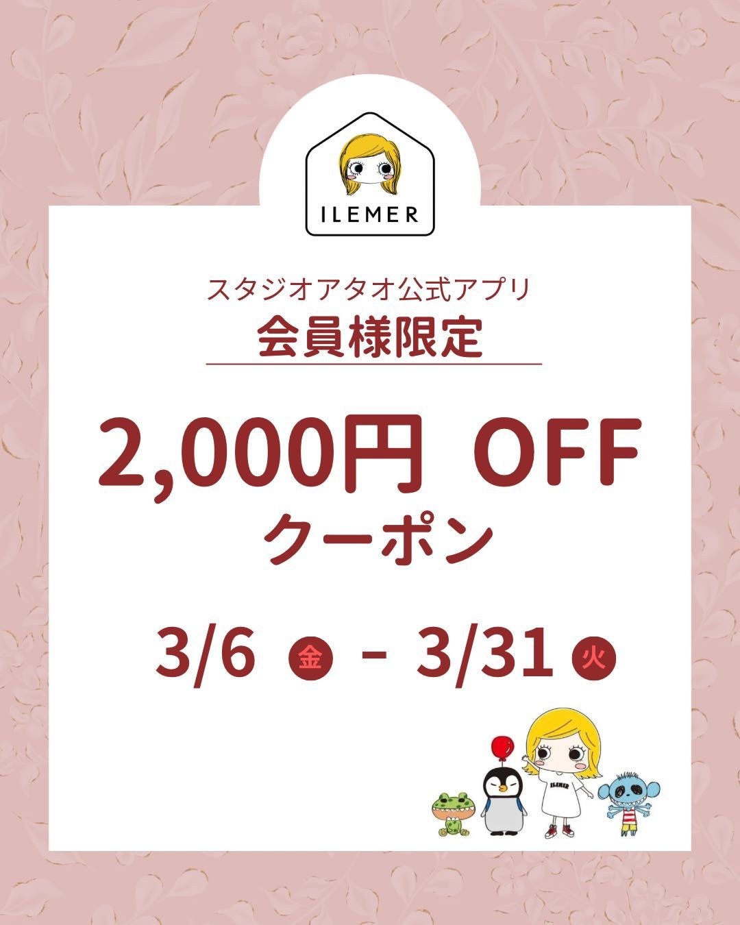〇イルメールギャラリー、ILEMER公式オンラインストアはクーポン利用対象外の店舗となります。また、カプセルトイも除外となりますため、予めご了承ください。