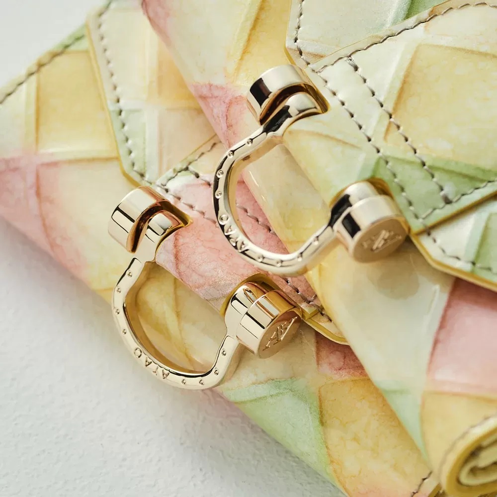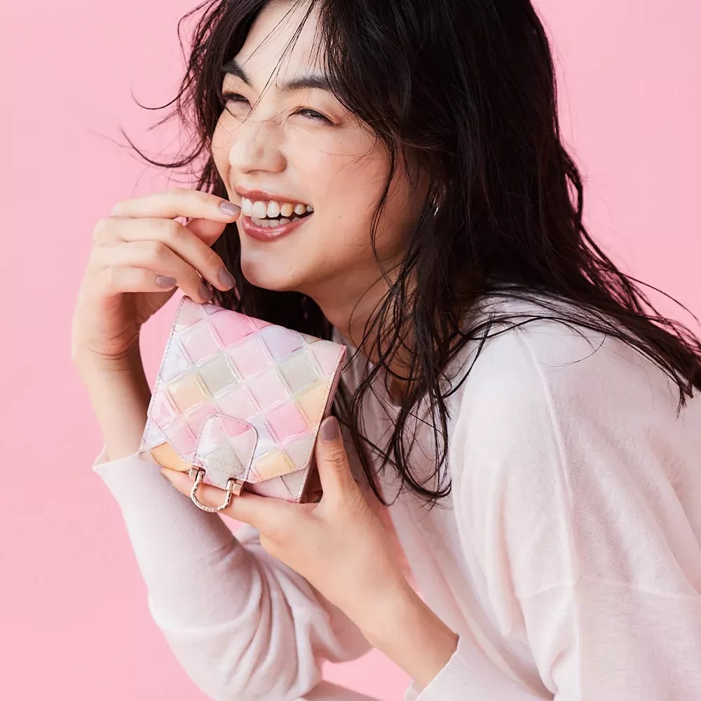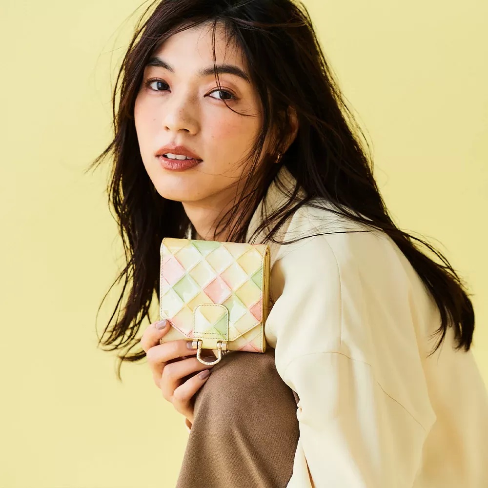ふわりと灯るやさしいイエローをベースに、ピスタチオグリーン、ストロベリーピンク、ミルクベージュを織り交ぜ、見ているだけで心がほどける、ハッピーなカラーリング。色とりどりのキャンディーのかわいさを、光沢が美しいエナメルレザーにギュッと閉じ込めました。色と色の調和が、まるで陽だまりの祝祭のように輝き、手に取った瞬間、あなたの日常を明るく照らしてくれます。