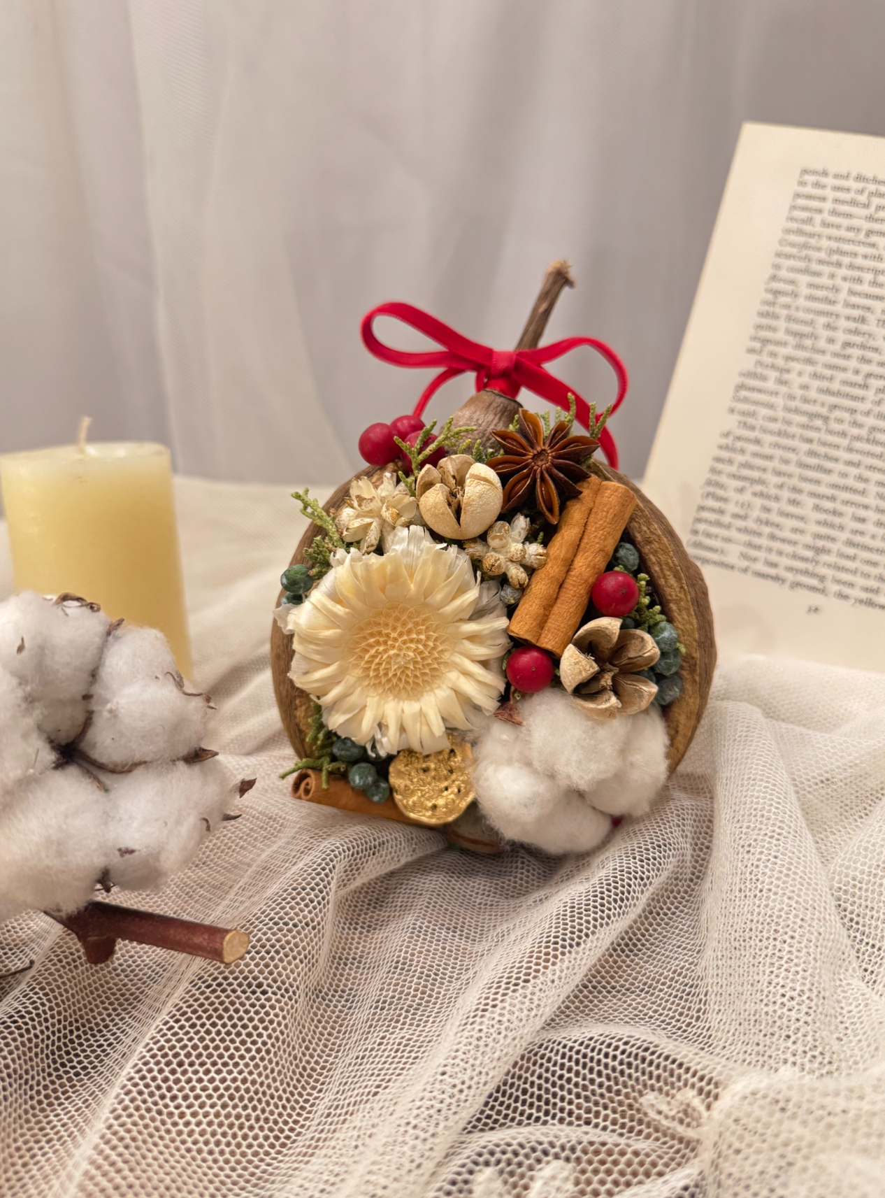 ローズヘッドの実や、コットンフラワーが暖かい印象を与え