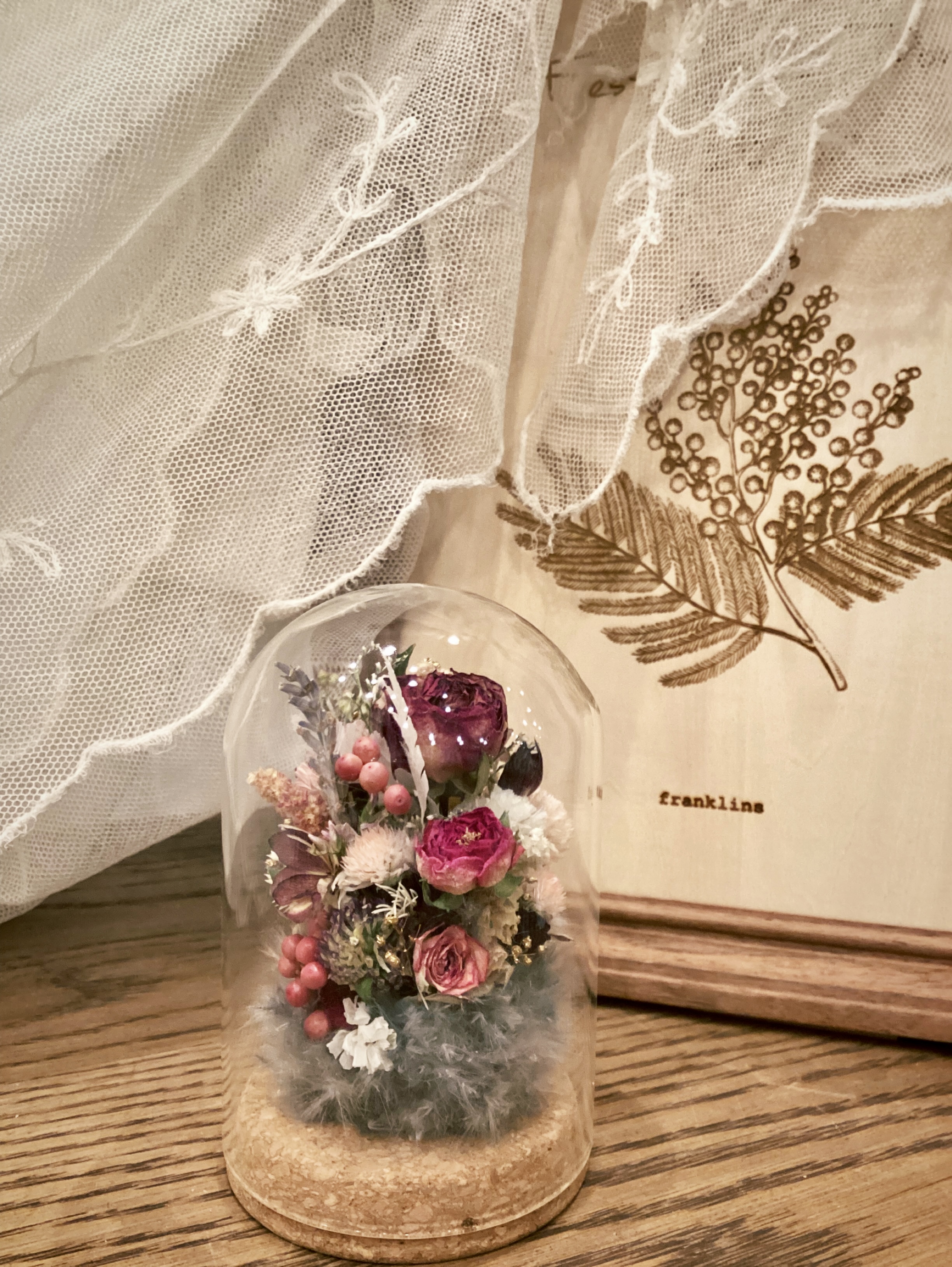 こちらはガラスのクリアフレームにブーケやリース状のドライフラワーを閉じ込めており