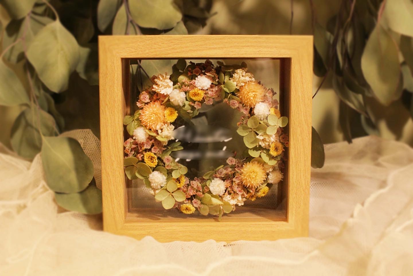 木漏れ日のような暖かさを感じるリースを閉じ込めた、クリアフレームのご紹介です♪