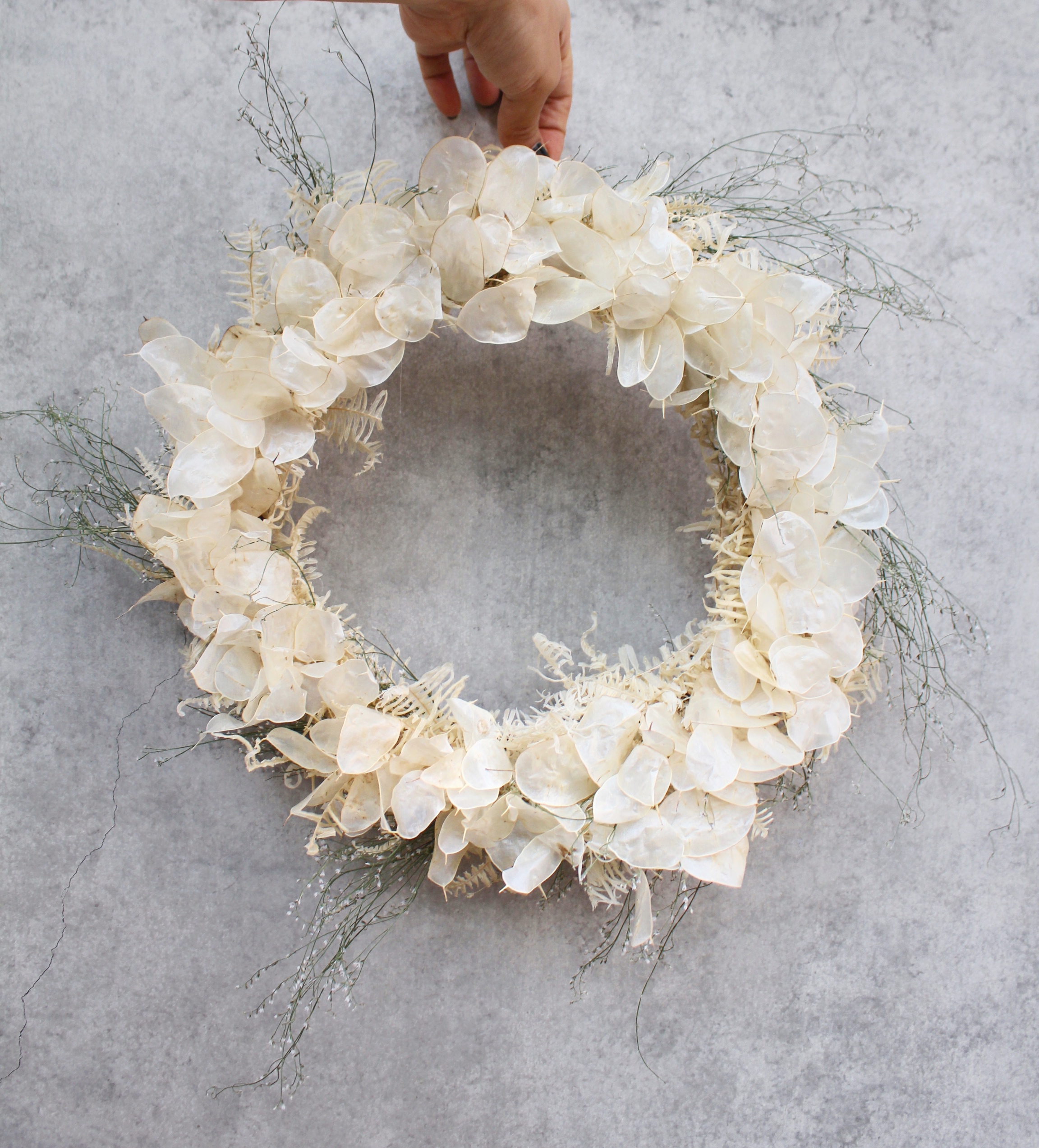 コットンフラワーとパームフラワーといったホワイトカラーのお花を使用し、お部屋にも飾っていただきやすく、柔らかくあたたかい印象に仕上がりました。