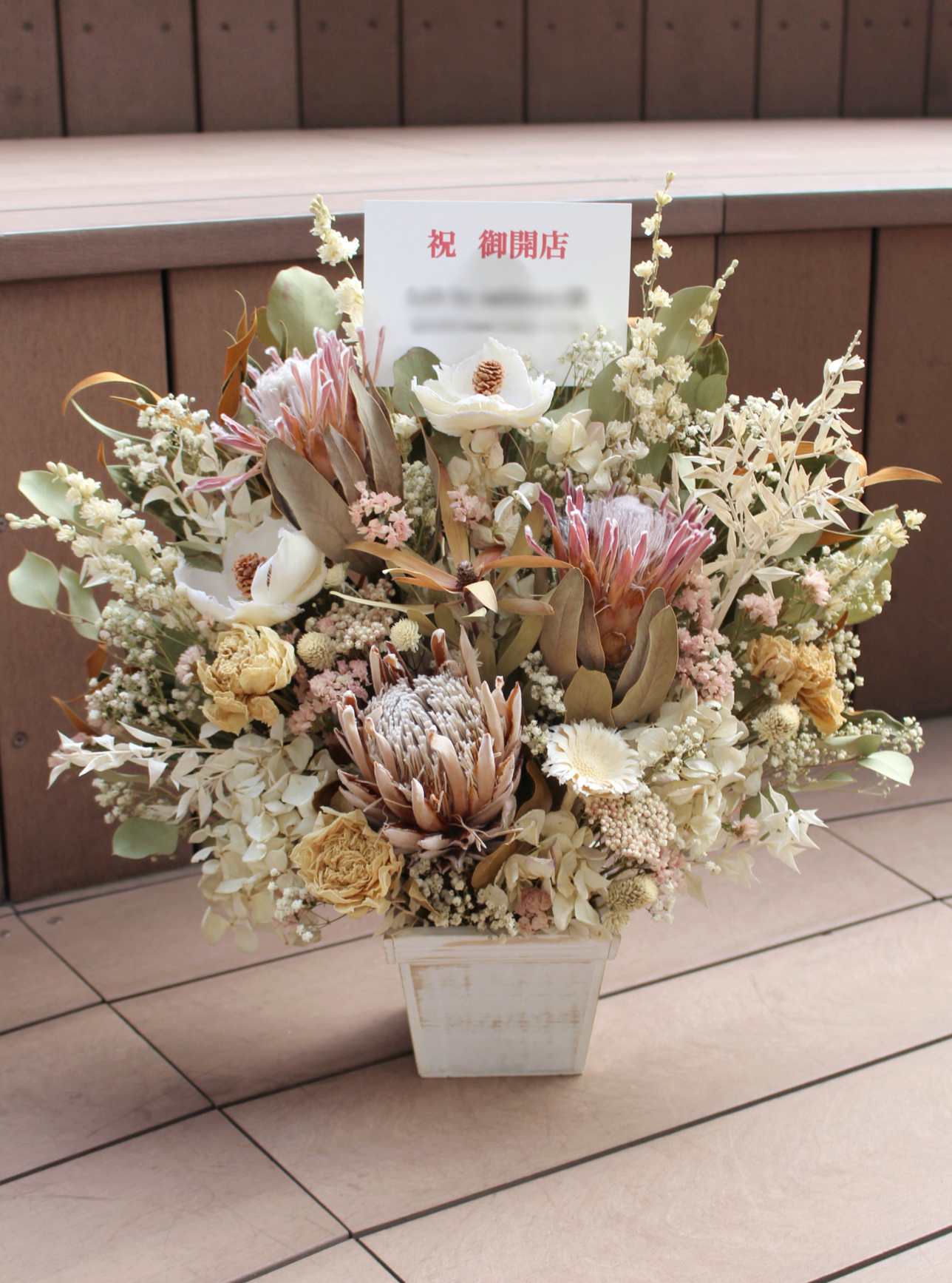 店頭にあるシリンダー型ドームのお花のお色味をお客様か気に入られ、それと似たお色味のお花で作成しました!