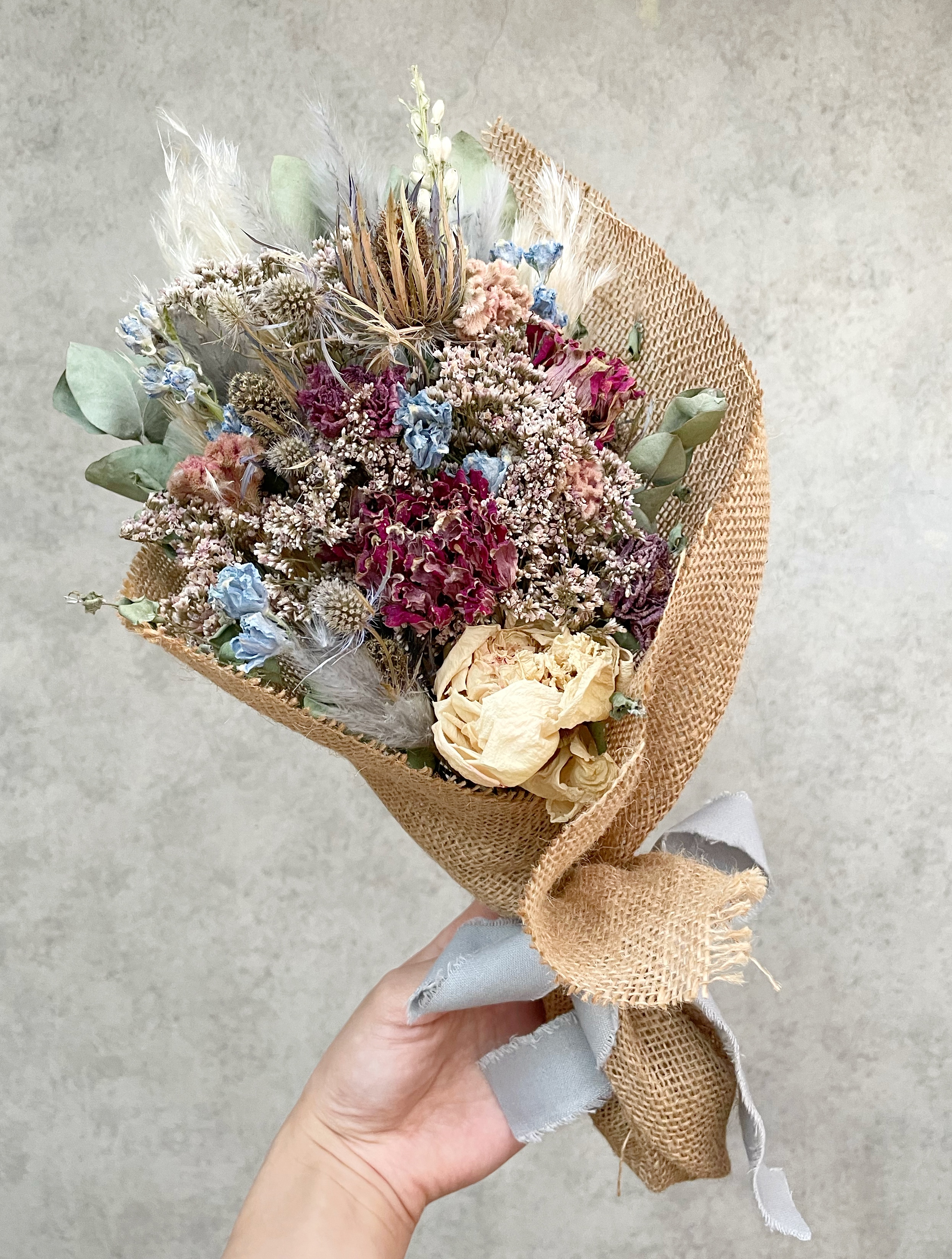 デルフィニウムやかすみ草といった優しい水色を全体に散りばめ、