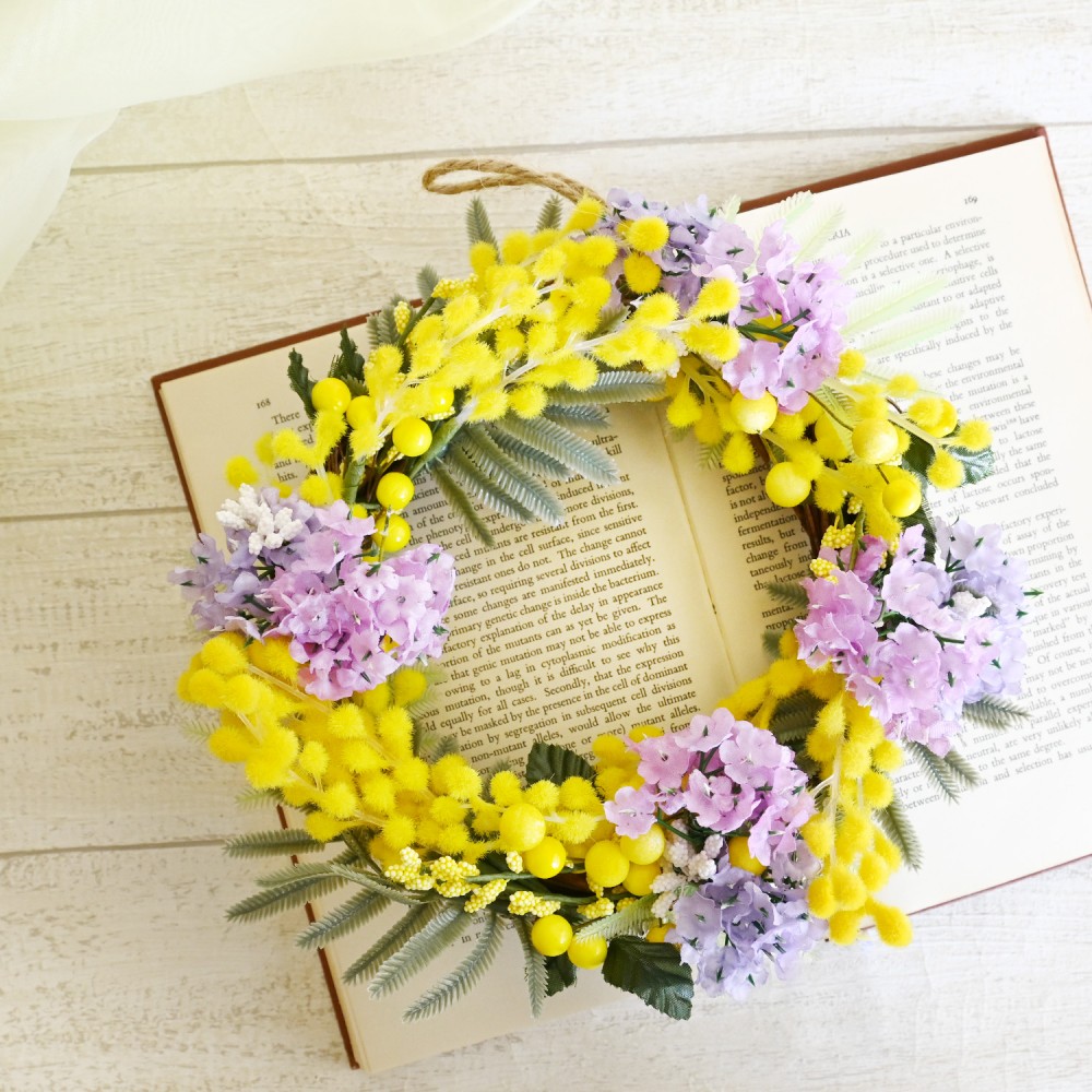 ミモザをふんだんに使ったボリュームたっぷりのリース。