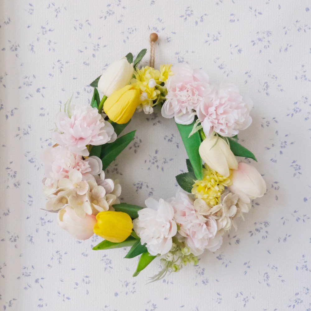 チューリップを贅沢にあしらった、春色いっぱいのリース。